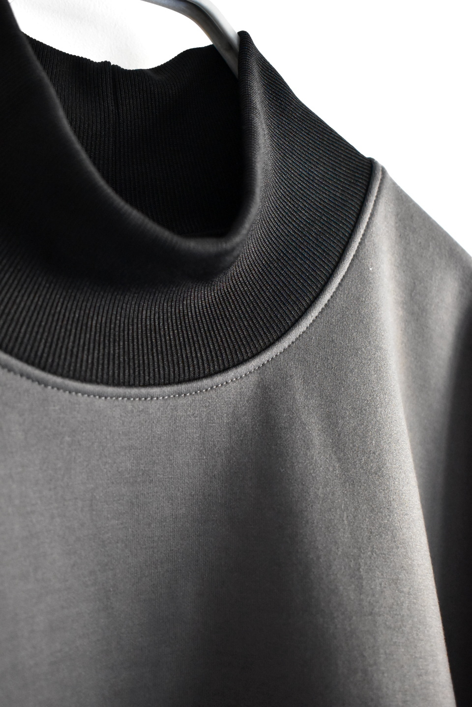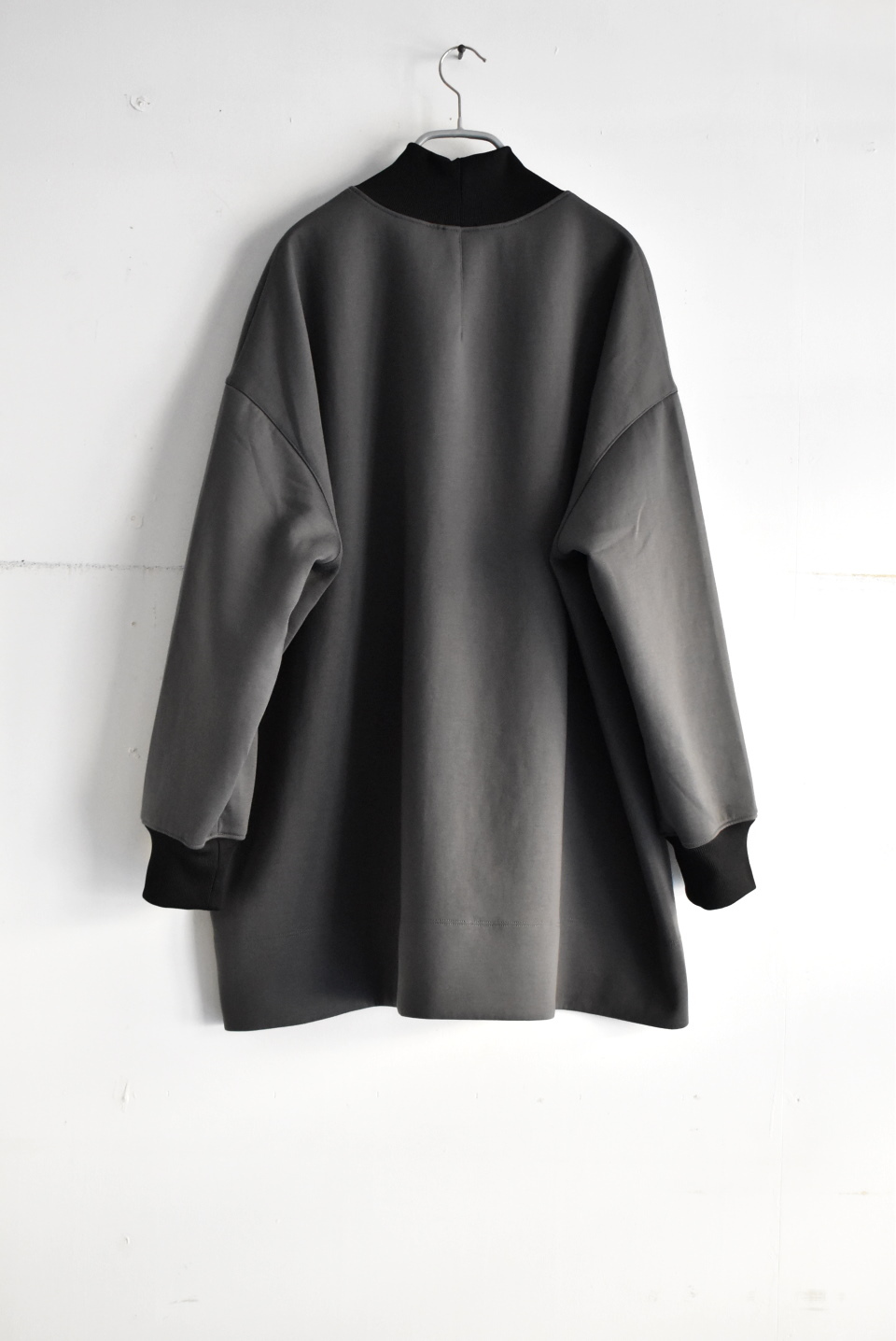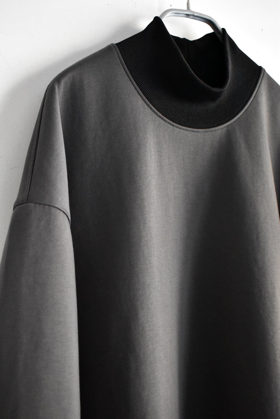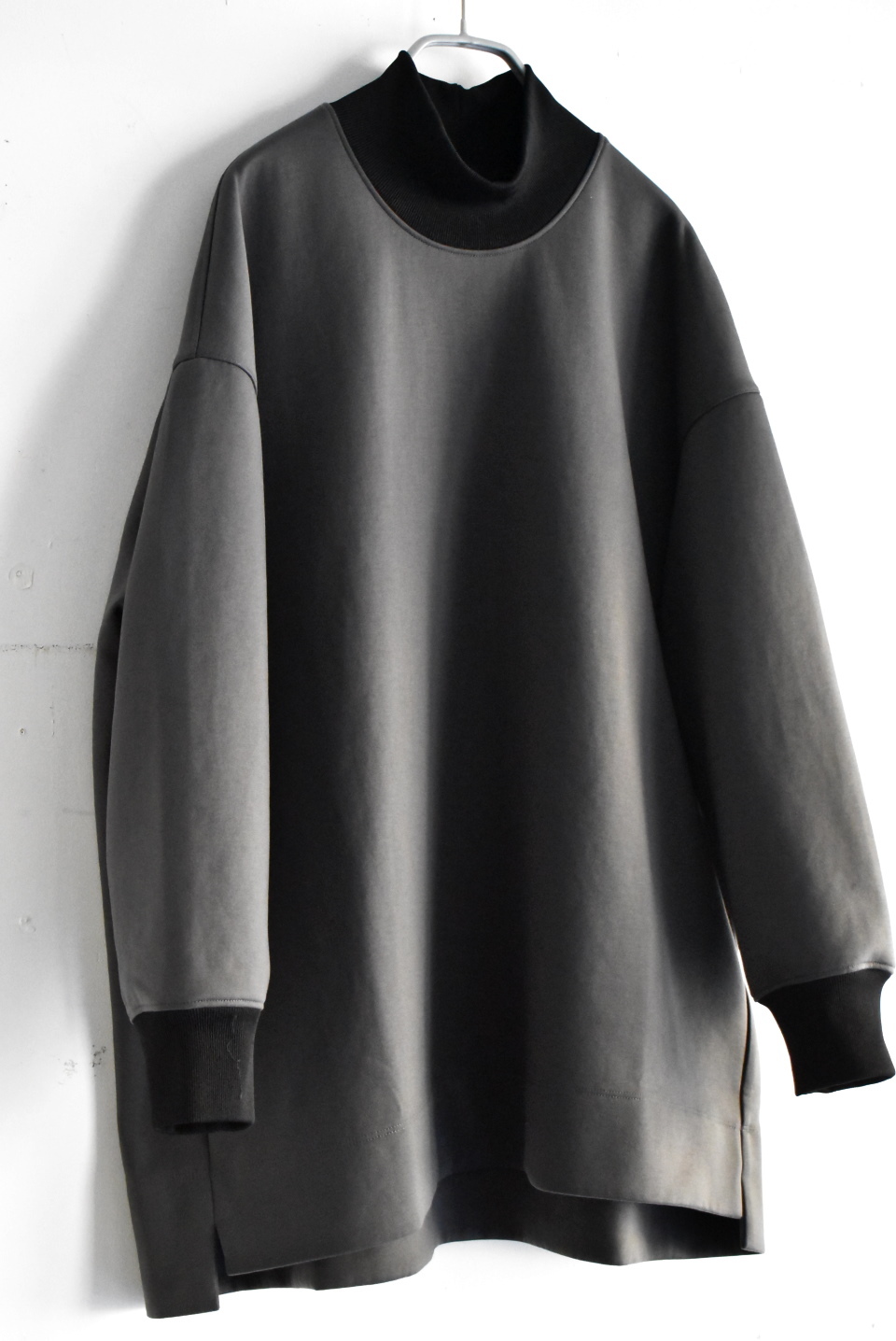 ネックと袖に黒リブ配色のハイネックプルオーバー。フィット感のあるハイネックリブスタンドのメンズライクでオーバーサイジングのゆったりシルエットです。